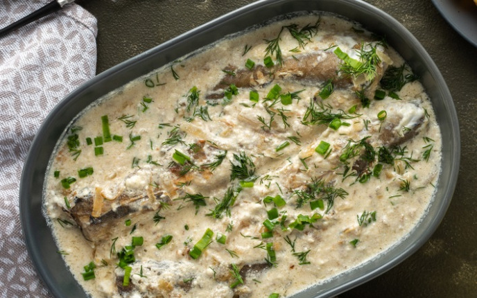 За сос: Загрејте две лажици масло, додајте две лажици брашно и малку сол. Мешајте неколку минути за да добиете смеса со светла боја. Во смесата додајте чаша вино и чаша вода. Варете кратко со мешање. Прелијте ја рибата со овој сос и запечете за кратко време. Наросете со сечкан магдонос.