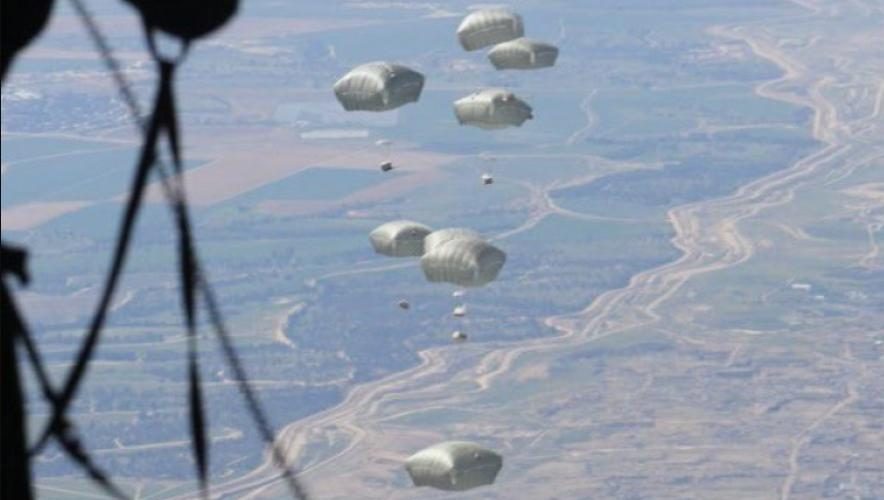 На снимката објавена на социјалните мрежи се гледа како неколку пакети паѓаат со екстремно голема брзина на земја, исфрлени од транспортен авион.