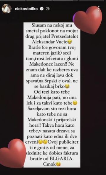 – Слушам на некој му сметал поклонот на мојот драг пријател Претседателот Александар Вучиќ. Братле (че говорам твој матерни јазик) седи там, троши лефчетата и глуми Македонец лажен!