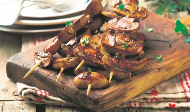 Измијте ги печурките и исечете ги на дебели парчиња. Измешајте ги маслиновото масло и зачините, па во смесата ставете ги печурките. Оставете ги да се маринираат половина час, а потоа наредете ги како ражничи. Се печат на грил тава и се посипуваат со соја сос. Послужете со ориз на пареа.