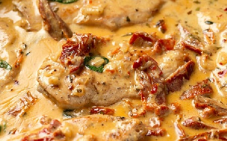 Оставете да се готви околу 5 минути, односно додека течноста не се намали за половина. Додадете ја павлаката и нежно мешајте додека сосот не се згусне, околу 3 минути. Измешајте го пармезанот и сушените домати. Вратете го пилешкото во тавата и гответе околу 4 минути. Тргнете од оган и послужете со босилок.