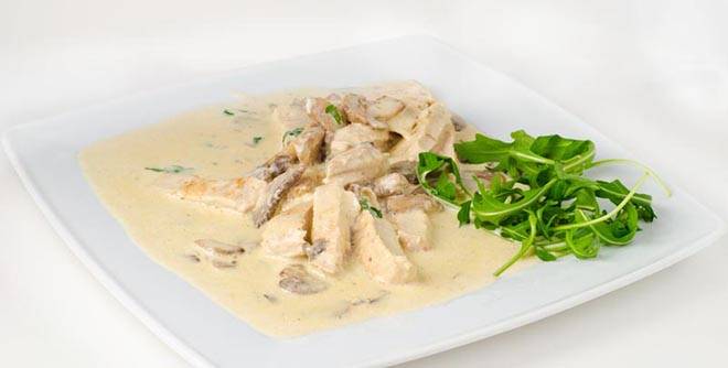 Додајте бело вино и динстајте додека да се впие во месото. Додајте го сечканиот лук, продинстајте, додајте павлака за готвење и по потреба малку вода. Зачинете и варете уште неколку минути.