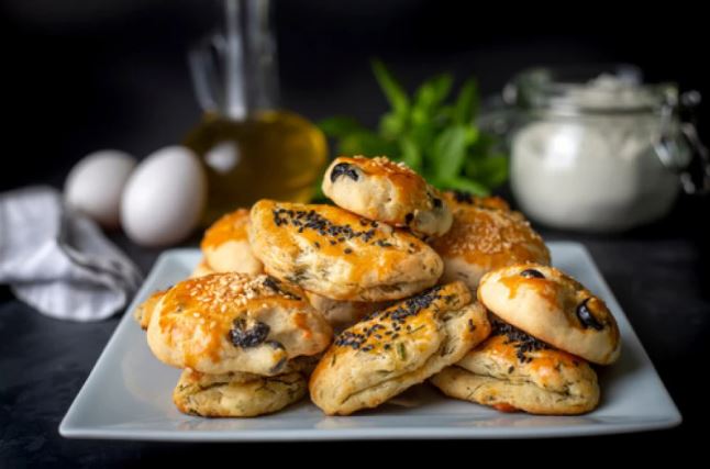 За тестото измешајте путер на собна температура со прашок за пециво, сол и павлака. Постепено додавајте просеано брашно и сечканите маслинки, па замесете мазно тесто. Расукајте на набрашнета површина до дебелина од 1 сантиметар, па погачите исечете ги со калап. Се ставаат на плех обложен со хартија за печење. Премачкајте со мешавина од изматено јајце и млеко. Се пече на 200 степени 10 минути.