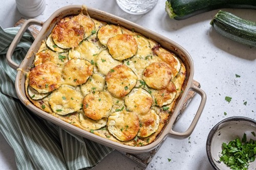 Огноотпорниот сад намачкајте го со масло, па наредете ги тиквичките, па доматите. Постапката повторете ја додека не останете без зеленчук.