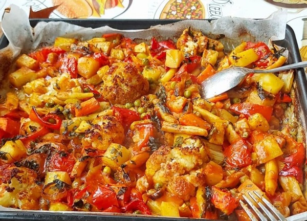 Брокулата исечкајте ја на цветчиња, па ставете ја во тавче и покријте ја со вода. Посолете и прелијте со 2 лажици млеко. Гответе додека не зоврие, па оставете уште 2 минути. Процедете и истурете ја во огноотпорен сад. Истата постапка се користи и со карфиолот. Исечете го на цветови, па истурете го во тенџере и покријте го со вода. Посолете и истурете 2 лажици млеко, па варете додека не зоврие. Процедете и истурете во огноотпорен сад. Во тава со малку масло пропржете го ситно сечканиот кромид и кога ќе омекне додадете го сечканиот морков. Потоа, половина минута пред да биде готов зеленчукот, додадете го мелениот лук. Измешајте и истурете во огноотпорниот сад. Промешајте и додадете ја пиперката исечена на ленти. Додадете ги и шери доматите исечени на половина. Јајцата се матат, па се става сол и бибер. Додадете масло и брашно и добро измешајте, па прелијте со млеко. Добро измешајте и додадете сечкан магдонос и копар. Прелијте го зеленчукот и посипете со рендано сирење. Се пече во загреана рерна на 180°C околу 40 минути.