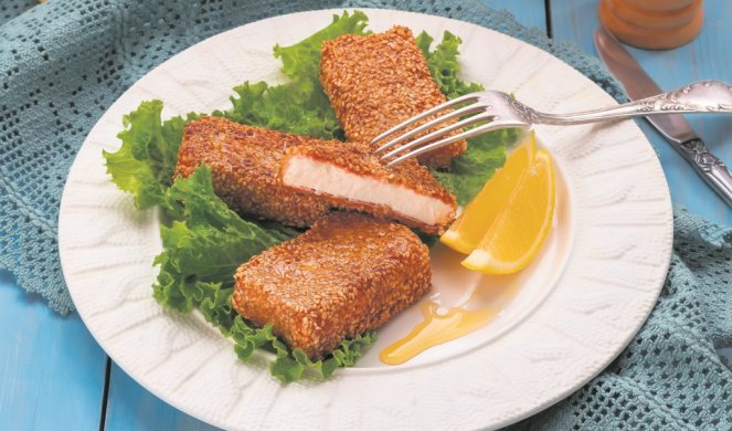Исушете ја фетата со крпа, а потоа исечете ја на парчиња дебели два сантиметри. Во првиот сад изматете ги јајцата, во вториот ставете го брашното, а во третиот презлата измешана со сусам, бибер и мелена пиперка. Превртете ги парчињата сирење прво во брашно, потоа во јајца и на крај во презла. Ако сакате, повторете ја постапката уште еднаш. Пржете во врело масло додека не поруменат. Исцедете на салфетка и сервирајте.
