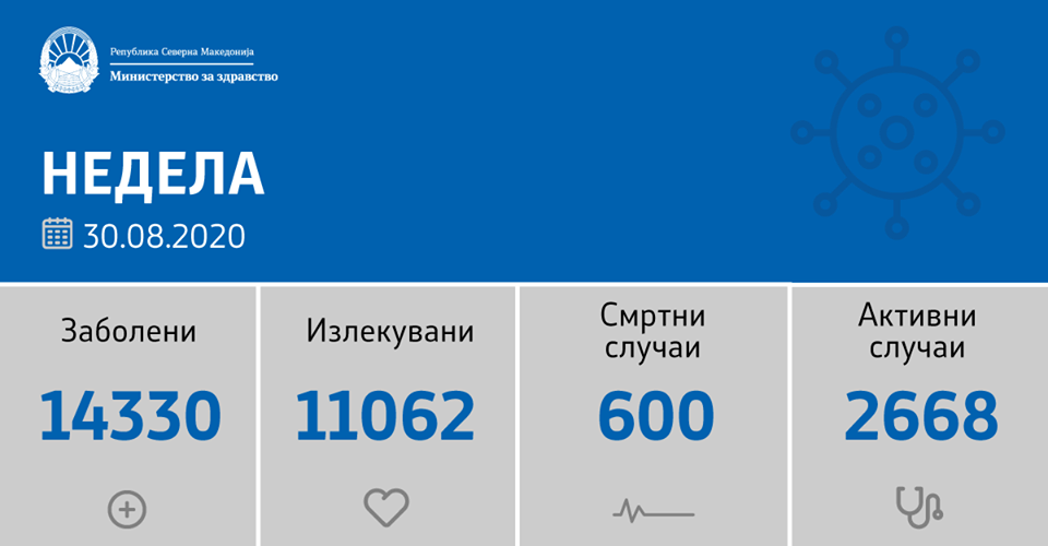 Вкупната бројка на ковид дијагностицирани во нашата земја од почетокот на епидемијата изнесува 14330, бројката на оздравени пациенти е 11062, на починати е 600, а во моментов бројот на активни случаи во земјата изнесува 2668.ок