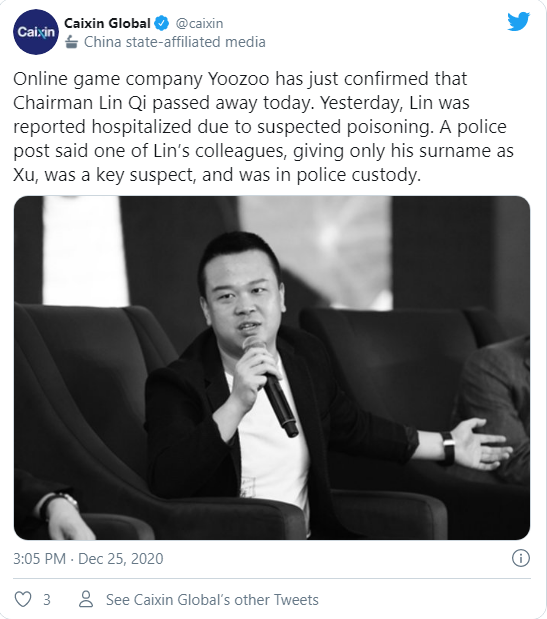 39-годишникот, кој воедно бил претседател на кинеската компанија „Јоузо груп“, наводно бил отруен од негов соработник. „ The Sun “ пренесува дека локалната полиција соопштила дека еден од колегите на Лин е главниот осомничен за неговата смрт. Полицијата го објави само презимето на осомничениот, Ксу и потврди дека тој останува во притвор.