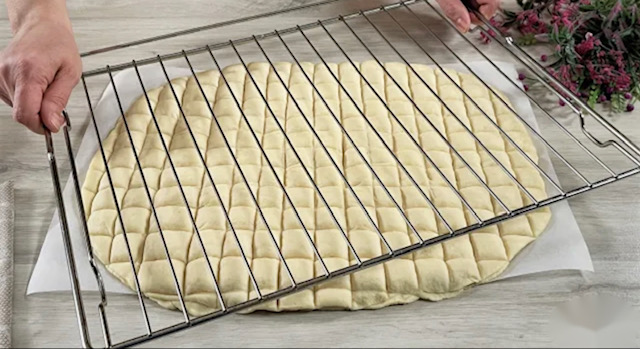 Со помош на решетката од рерна обликувајте квадратчиња, исечете ги, внимателно префрлете го тестото во плехот, па оставете 10-15-тина минути да одмора додека се загрева рерната на 180 степени.