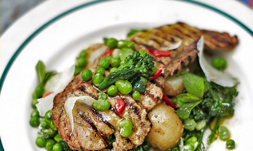 Чистото парче свинско месо прво се маринира во мајчина душица и лук и се пече во грил тава, а се служи со млади компири, грашок, боранија и брокули со лимон, нане и чили сос.