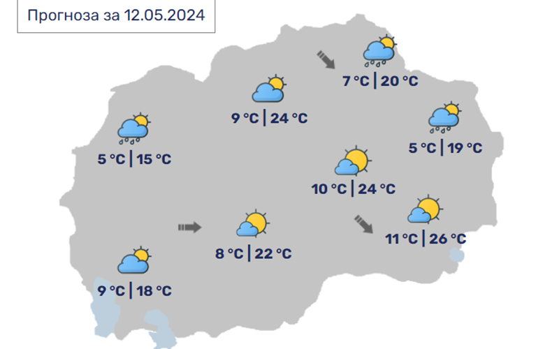 Минималната температура се движи во интервал од два до 11 Целзиусови степени, а максималната ќе достигне до 16 до 26 степени.