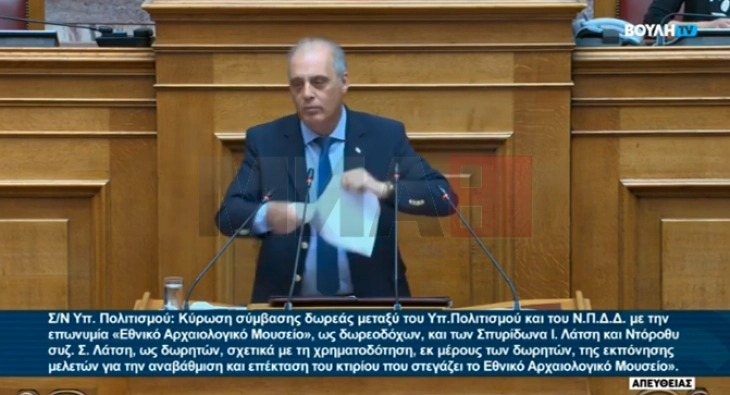 „Ова е Договорот од Преспа. Ако постоеше кредибилна, национална, патриотска, општествена, народна грчка Влада ќе го стореше ова“, рече лидерот на десничарско-националистичка партија „Грчко решение“ – Кирјакос Велопулос, од говорницата на Парламентот и го искина листот со Договорот од Преспа, јави дописничката на МИА од Атина.