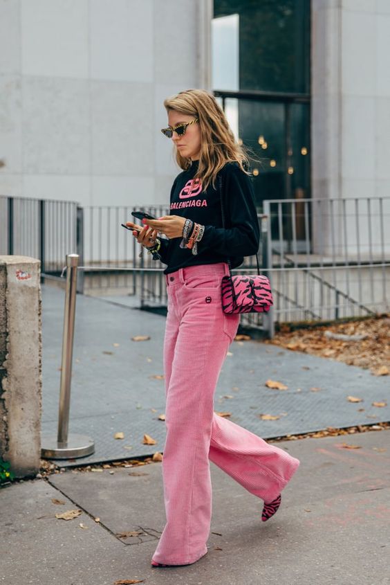 Розови плишани панталони во комбинација со црна маичка и чанта во исти нијанси ќе одговараат на тинејџерите, но и на сите оние кои сакаат да изгледаат помлади.