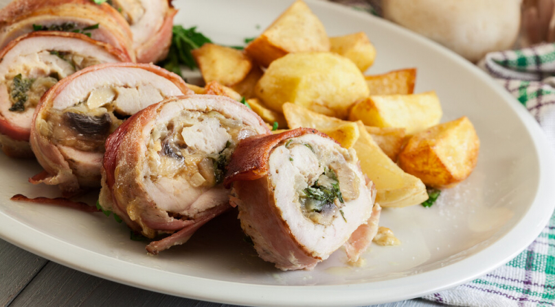 Направете шницли од месото. Посолете го со вегета, сол, додајте бибер и премачкајте го целото месо. Направете ролат, врзете со конец и ставете го во тава. Прелијте со растопениот путер, вино и печете 45 минути на 200 степени. Откако ќе се испече ролатот, исечете го конецот, оставете го да отстои 10 минути и исечете. Послужете со печени компири.
