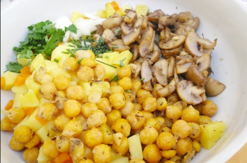 Во сад измешајте ги компирите и морковот, наутот, печурките и исечкан кромид. Посолете и наросете црн пипер. Додадете оригано или мајчина душичка, масло и лимонов сок и промешајте ја салатата.