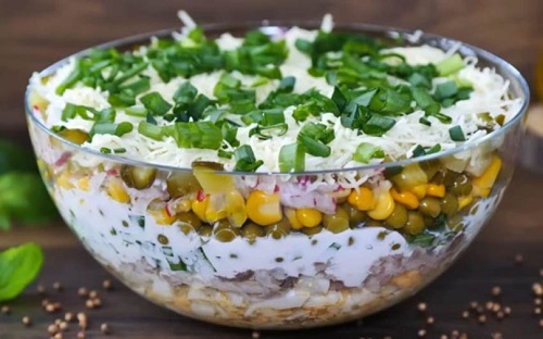 Јајцата сварете ги и исечкајте ги, па истурете ги во сад за салата. Одозгора ставете ја процедената туна и добро притиснете. Врз неа посипете сечкан власец, па измешајте јогурт и мајонез, посолете и побиберете, па половина од количината прелијте го врз власецот. Добро размачкајте, па истурете го процедениот грашок, а одозгора пченката. Потоа наредете ги ренданите ротквици и сечканите кисели краставички. Прелијте ја другата половина од смесата, посипете со рендано сирење и исечканиот власец.