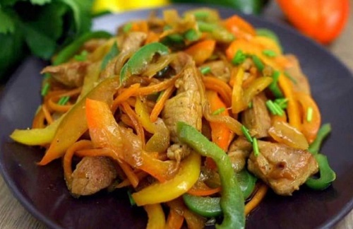 Измешајте малку сос, оризов оцет, мелен лук, мелена пипер и кафеав шеќер. Месото исечете го на ленти, па испржете го на малку масло. Кога ќе биде речиси готово, додадете кормид исечен на ленти, а кога ќе омекне додадете и рендан морков. По две минути додадете ја и пиперката исечена на ленти, па посолете и побиберете. По две минути сипете го сосот, па промешајте. Гответе додека зеленчукот целосно не омекне.