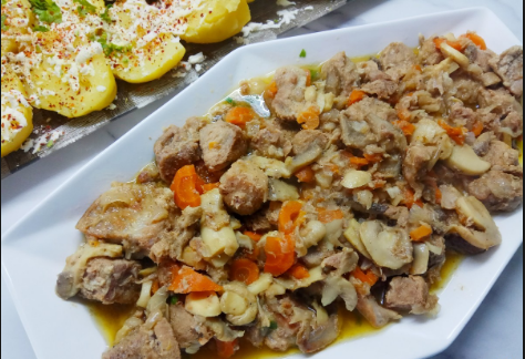 Месото исечете го на коцки и посолете го. Испржете го на масло, додадете 200 мл вода и динстајте додека не испари. Потоа додадате ја сланината и пржете додека не порумени. На крајот додадете ги морковите и кратко запржете.