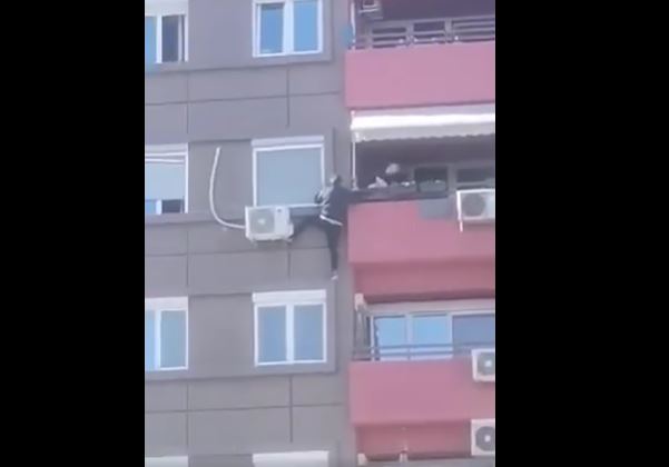 На социјалните мрежи веќе вирално се шири видео направено во скопската населба Ѓорче Петров на кое се гледа како маж виси од клима уред закачен на зграда.