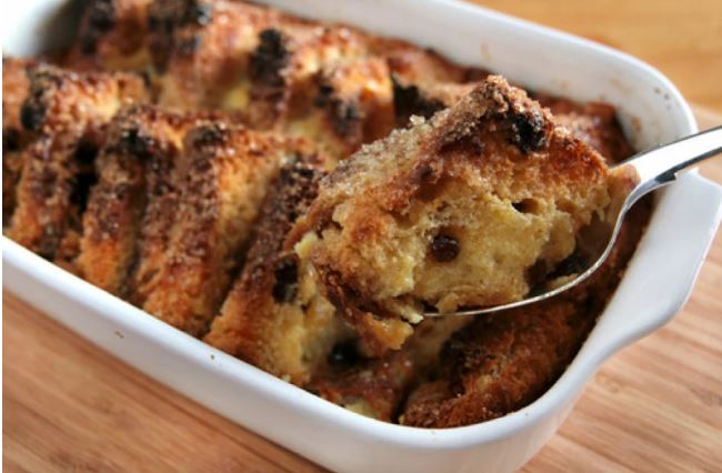 Подмачкајте го со путер огноотпорен сад и кришките леб. Половина од парчињата леб исечкајте ги на триаголници и распоредете ги на дното. Посипете со една лажица шеќер и половина од сувото грозје. Покријте со уште еден слој леб и повторете ја постапката. После тоа, изматете три јајца и додадете млеко. Прелијте ја смесата врз лебот и оставете да отстои 10-20 минути. Се пече во загреана рерна на 180 °C околу 20 минути. Посипете со малку цимет и морско оревче и остатокот од шеќерот и послужете.