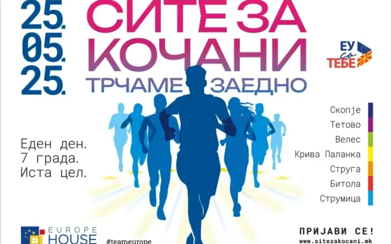 Со организирање на денешната хуманитарна трка за погодените од трагедијата во Кочани, Делегацијата на Европската Унија и мрежата на Јуроп хаус, оваа година ќе го одбележат „Денот на Европа“.-На 25 мај, истовремено во седум града – Скопје, Струмица, Крива Паланка, Битола, Велес, Струга и Тетово, ќе трчаме заедно со една единствена цел: да му подадеме рака на Кочани. „СИТЕ ЗА КОЧАНИ – ТРЧАМЕ ЗАЕДНО!“ е хуманитарна иницијатива во која може да учествува секој, без разлика на возраста или физичката подготвеност. Трките се наменети за сите: рекреативци, спортисти, аматери, помлади и повозрасни, бидејќи не се работи за километри, туку за солидарност, наведуваат од Делегацијата на ЕУ.Пријавувањето, како што се наведува, е отворено и може да се врши преку платформата https://sitezakocani.mk, каде што секој заинтересиран може да избере град и да стане дел од најважната трка оваа година. Сите средства собрани од котизациите ќе бидат донирани преку Црвениот крст, кој ќе ги насочи кон заедницата во Кочани, осигурувајќи дека секоја донација ќе оди таму каде што е најпотребна.-На 25 мај, нема да трчаме за резултати, ниту пак за награди – ќе трчаме за солидарност и за вредностите кои нѐ дефинираат како општество и како заедница. Сите за Кочани – да трчаме заедно! Придружете ни се, се наведува за настанот чија цел е да собере средства за погодените од неодамнешната трагедија во Кочани. Дополнително, на денот на трката ќе биде поставена и кутија за донации од страна на Црвениот крст, каде што сите присутни ќе имаат можност да донираат дополнително, стои во највата за хуманитарната трка.Во Скопје, трките ќе се одржат на Средно Водно. Трката од 5 километри започнува во 10:00 часот, додека трката на 10 километри ќе започне во 11:00 часот. Пристапот со возила кон Средно Водно ќе биде регулиран, а паркингот нема да биде достапен за возила. За таа цел, ќе биде обезбеден организиран бесплатен автобуски превоз од паркингот кај Цветен пазар до Средно Водно. Превозот ќе се одвива од 08:30 до 10:10 часот, а повратниот превоз ќе биде достапен од 12:00 до 14:15 часот.Граѓаните кои ќе учествуваат во трката се охрабруваат да го користат организираниот автобуски превоз. Дел од автобусите кои ќе се користат се еколошки и се обезбедени со поддршка од Европската Унија, во рамки на напорите за одржлива мобилност и заштита на животната средина. За оние кои сакаат дополнителен спортски предизвик, пешачката рута од подножјето до Средно Водно останува отворена.На денот на трката (25 мај) нема да се издаваат стартни броеви. Подигнувањето на стартните броеви за учесниците од Скопје се одвуваше вчера и завчера во просториите на Europe House Скопје.Трката е наменета за граѓани од сите возрасни групи, без разлика на физичката подготвеност. Пријавувањето е веќе затворено, а сите дополнителни информации за локациите и времето на трките можат да се најдат на социјалните медиуми на секој Јуроп Хаус поединечно.Средствата собрани преку котизациите ќе бидат уплатени на Црвениот крст на Република Северна Македонија и ќе бидат насочени кон поддршка на заедницата во Кочани.