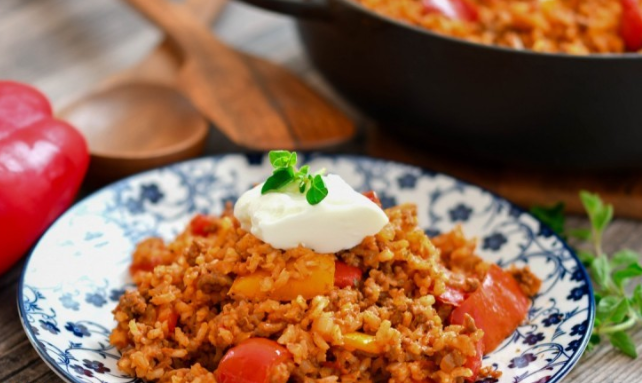 Ситно се сечка кромидот, а морковот се ренда, па заедно со месото зе запржуваат во тавата во која ќе се печат. Откако ќе запржат, им се додава да запржи и оризот, па се додава црвениот пипер.