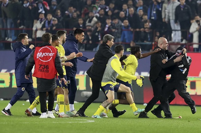 Толпа навивачи упаднаа на теренот на стадионот на Трабзонспор во неделата вечерта по последнио судиски свиреж, со што беше означен крајот на натпреварот кој нивниот тим го загуби, додека играчите на истанбулски Фенербахче славеа победа. Навивачите им се заканувале и ги нападнале играчите и тренерот на истанбулскиот клуб и голманот на Фенербахче.