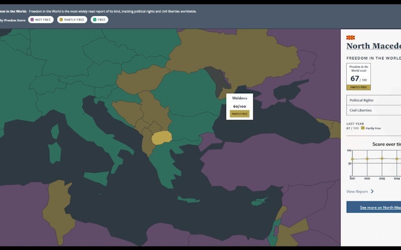 Македонија и годинава останува „делумно слободна“ земја според нивото на граѓански слободи и политички права, покажува последниот извештај на „Фридом хаус“ „СЛОБОДА ВО СВЕТОТ“, кој се однесува на 2025 година.