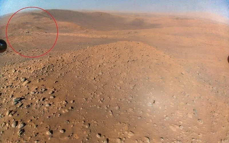 Летот се случи во саботата, на 22 април, а Ingenuity го фотографираше роверот Perseverance од висина од 12 метри над површината на Марс. На фотографијата, роверот се гледа во горниот лев агол, додека позадината е црвена почва. Роверот е потешко да се забележи поради големите карпи на површината на Марс.
