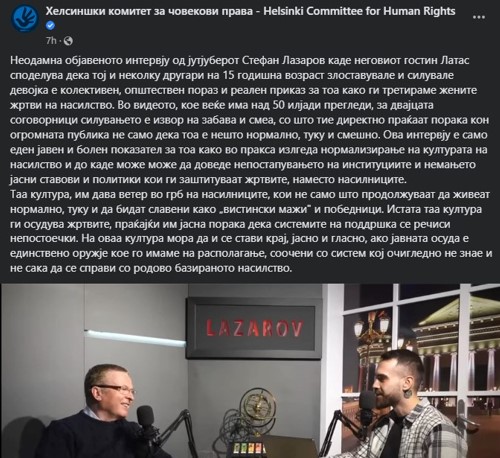 Неодамна објавеното интервју од јутјуберот Стефан Лазаров каде неговиот гостин Латас споделува дека тој и неколку другари на 15 годишна возраст злоставувале и силувале девојка е колективен, општествен пораз и реален приказ за тоа како ги третираме жените жртви на насилство.