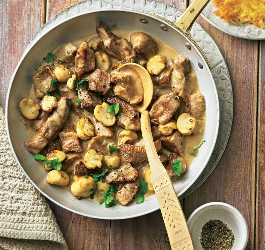 Исчистете го месото, па исечете го на ленти и посипете го со брашно. Во тава загрејте половина путер и масло. Штом путерот стане пенаст, додадете го месото и кратко пропржете го од сите страни. Ставете го во чинија.