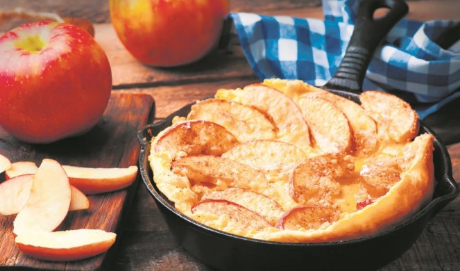 Во голема тава со метална рачка ставете го путерот, па ставете ја во рерна загреана на 200 степени. Во сад измешајте брашно, прашок за пециво, сол, шеќер, млеко и јајца. Извадете ја тавата од рерна, одозгора ставете ги исечените јаболка и прелијте ги со смесата за палачинки. Посипете со цимет и печете во рерна 20-25 минути. Превртете во чинија и послужете веднаш.