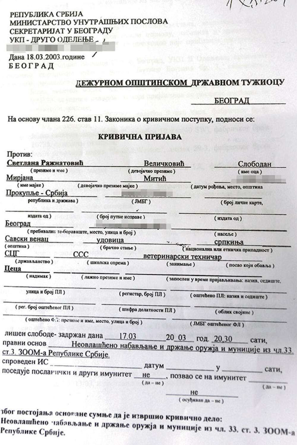 На почетокот на пријавата се наведуваат основните податоци на пејачот – име на татко и мајка: Слободан и Мирјана, датум на раѓање: 14.06.1973 година, брачна состојба: вдовица, занимање: ветеринарен техничар… Потоа се наведува дека била лишена од слобода на 17 март 2003 година во девет и пол навечер.