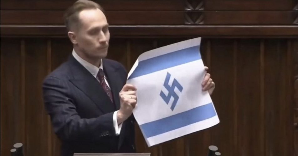 Конрад Беркович, член на полскиот парламент од екстремно десничарската Партија на конфедерацијата, на седница донесе израелско знаме, на кое наместо шесткраката Давидова ѕвезда беше прикажана нацистичката свастика. Долниот дом го емитуваше настанот во живо на својот YouTube канал.