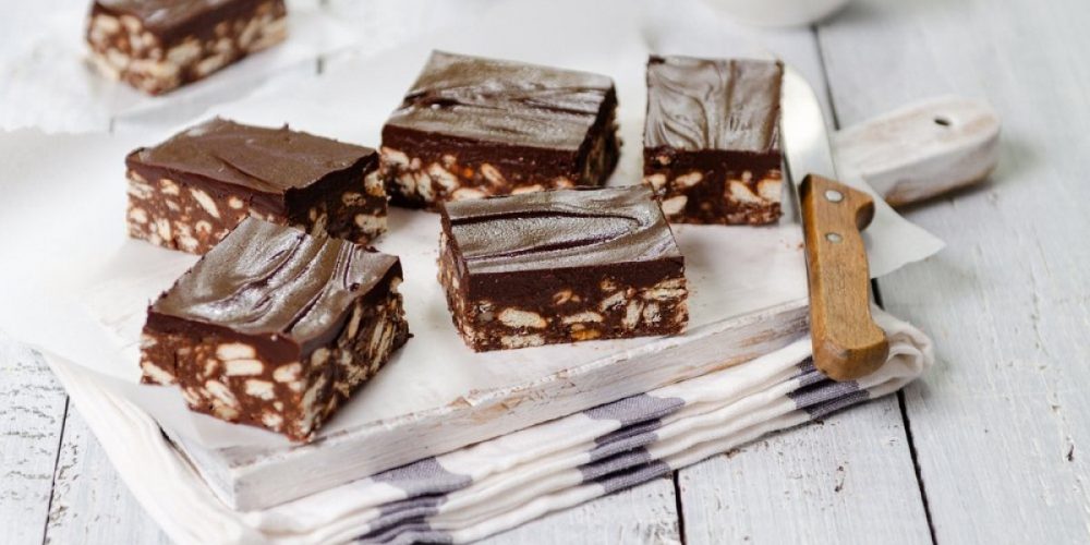 Во поголем сад ставете ги издробените бисквитите, а потоа прелијте со чоколадната смеса. Добро измешајте за бисквитот целосно да се премачка со чоколадо.