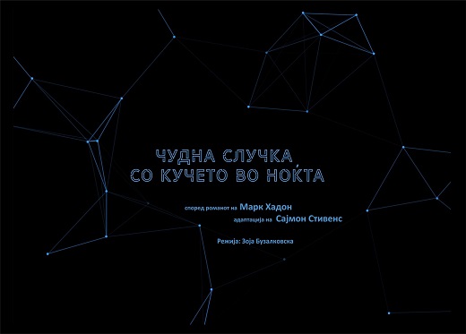 Драмскиот текст „Чудна случка со кучето во ноќта“ (The Curious Incident of the Dog in the Night-Time) од Сајмон Стивенс е всушност адаптација на популарниот, истоимен роман на Марк Хадон од 2003 година. Овој роман освои 17 престижни награди, Меѓу кои и Whitebread Award. Адаптацијата е напишана во 2012 година и со успех изведена прво во Националниот театар во Лондон. Сместена во Свиндон и Лондон, приказната се однесува на 15-годишниот Кристофер Џон Френсис Бун, математички гениј, кој има неспецифицирано нарушување од аутистичен спектар. Кристофер треба да разреши една мистерија. Некој го убил соседското куче со вила и Кристофер е осомничен, па условно ослободен. Сакајќи да открие кој го убил Велингтон и одејќи спротивно на желбите и заповедите на татко му, Кристофер започнува истрага за убиството на кучето, поставувајќи му прашања и запишувајќи ги своите постапки и сознанија во книга. Кристофер има Аспагер синдром (кој припаѓа на фамилијата аутистични нарушувања) и никогаш претходно самиот не отишол подалеку од крајот на улицата, но детективската работа го носи во опасно патување кое го распаѓа целиот негов дотогаш познат свет. Космосот на оној кој „не може да лаже“ (што е во дефиницијата на неговата состојба) е тектонски изместен од сознанието дека е жртва на лагите на родителот, најблиските, единствената вистинска потпора, изворот на доверба и сигурност. Драмата темелно го преработува изворниот материјал. Наместо раскажувањето во прво лице како што е во романот, драмскиот текст претставува комбинација на односи и агли, од гледна точка на самиот Кристофер Бун, но и сите оние кои доаѓаат во допир со неговата книга или се дел од неа – неговата професорка, неговиот татко, неговата мајка… Резултатот е драма – во – драма. Она што „Чудна случка со кучето во ноќта“ ја прави возбудлив материјал за работа е темата што ја отвора овој текст. Тоа е светот на Кристофер, светот на „посебниот“, „различниот“, „отфрлениот“, „исмеаниот“, „потценетиот“. Во време во кое многу општества, па така и нашето, се борат за инклузија на луѓето со посебни потреби, да се работи еден ваков актуелен материјал се чини исклучително важно. Во таа смисла, претставата ќе има и едукативно – воспитна функција и ќе може да ја одреди за една од своите целни групи и младата тинејџерска публика. Од друга страна, пак, жанрот на црната комедија и на моменти сурово остриот, иако бескрајно духовит, јазик, ја носат пред се во вечерните термини и ја усложнуваат нејзината улога.