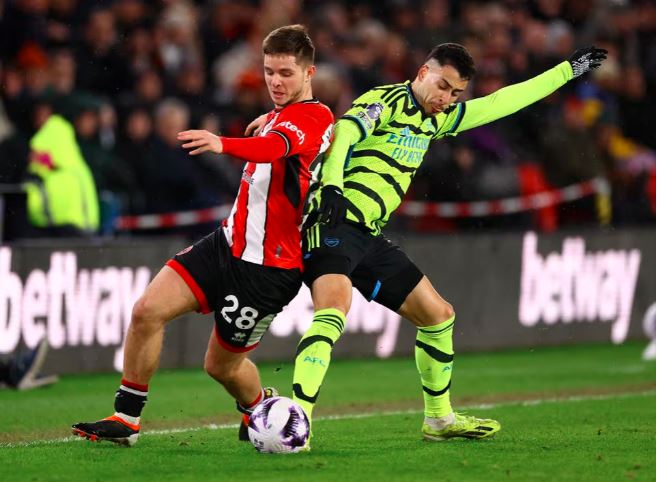 „Топчиите“ протатнеа низ „Брамал Лејн“, постигнувајќи пет гола во првото полувреме. Мартин Одегард ја отвори серијата во петтата минута, Џејден Богл ја погоди сопствената мрежа во 13. минута, а само две минути подоцна Габриел Мартинели погоди за 3:0. До крајот на полувремето меѓу стрелците се запишаа Каи Хаверц во 25. и Деклан Рајс во 39. минута.
