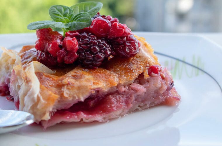 Поделете ги корите на половина. Во сад за печење раширете половина од корите, секоја премачкајте ја со филот. На средина ставете шумско овошје.