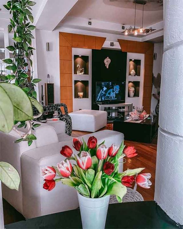 Во елегантно наместениот простор доминираат белата и бојата на дрвото, а на ѕидовите има разно-разни украси.