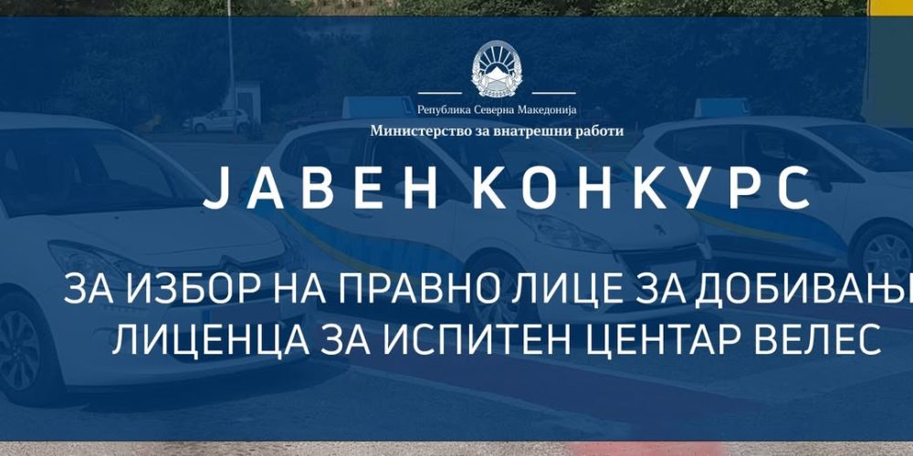 Врз основа на член 241 став (1) од Законот за безбедност на сообраќајот на патиштата („Службен весник на Република Македонија“ бр. 169/15, 226/15, 55/16, 11/18, 83/18 и „Службен весник на Република Северна Македонија“ бр. 98/19, 302/20, 122/21, 33/24, 208/24, 193/25, 258/25 и 58/26) и член 50 од Правилникот за начинот на спроведување на возачките испити и поблиските критериуми во однос на просторните услови и материјално – техничката и информатичката опрема на испитните центри и водењето на евиденциите во врска со спроведените возачки испити, како и начинот на издавање и одземање на лиценца за испитен центар, формата и содржината на образецот на лиценцата за испитен центар („Службен весник на Република Северна Македонија“ бр. 29/25 и 74/26), Министерството за внатрешни работи распишува