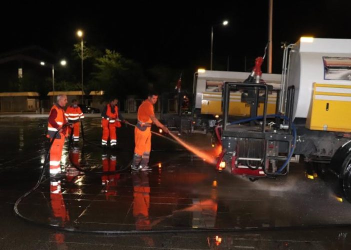 Екипите на ЈП Комунална хигиена-Скопје вечерва започнаа активности за рачно миење на сите пунктови за масовна вакцинација каде што се спроведува имунизацијата на жителите на градот Скопје против вирусот Ковид-19.