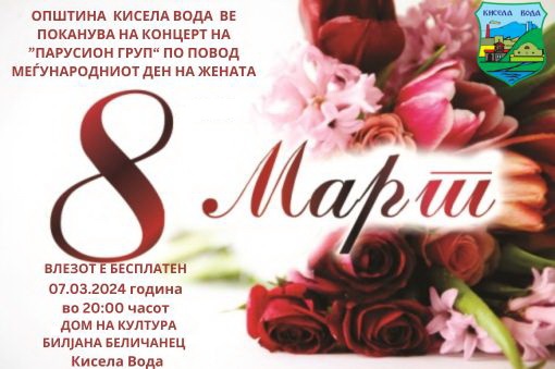 Во чест на 8 Март, Општина Кисела Вода ги поканува сите жени на концерт во Домот на култура “Билјана Беличанец”. Во четврток, 7-ми март, со почеток во 20 часот, пред публиката ќе се претстави македонскиот џез-состав “Парусион Груп” со неколку периоди од своето творештво. Премиерно ќе биде изведен новиот материјал “Feel the grooves”, типичен за звукот на денешницата, како и проектот “Агол” од минатата година.