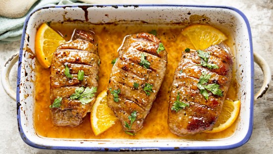 Во блендер измешајте сок од портокал со ѓумбир, бибер, излупени лути пиперки, лук и маслиновото масло. Прелијте ја маринадата врз месото и оставете да отстои 10 минути.