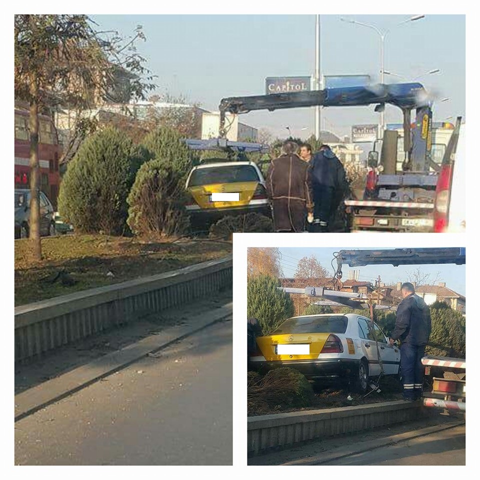 Фото: КАКО УСПЕА? Таксист се качи на тротар кој разделува 2 улици во АЕРОДРОМ