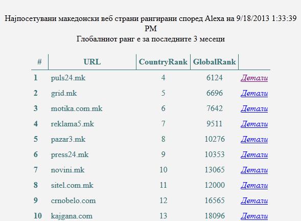 Топ 100 македонски сајтови што како сервис го нуди Пулс24, во последните 30 дена е најпосетувана статија.Пулс24 како сервис за посетителите ја обезбедува листата на најпосетувани македонски сајтови според Alexa. […]