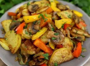 Идеално за вечера: Пржени компири со печурки, кромид и пиперка