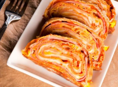 Пица на малку поинаков начин. Потребни состојки: – Тесто за пица – 2 дл пире од домати – 300 гр моцарела – 150 гр рендана гауда – 200 гр шунка […]