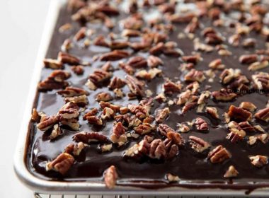Потребни состојки:400 грама шеќер240 грама брашно¼ лажица сол4 лажици какао220 грама путер230 милилитри топла вода230 милилитри матеница2 јајца1 лажичка сода бикарбона1 лажичка екстракт од ванилаПотребни состојки за глазура:60 грама сечкани […]