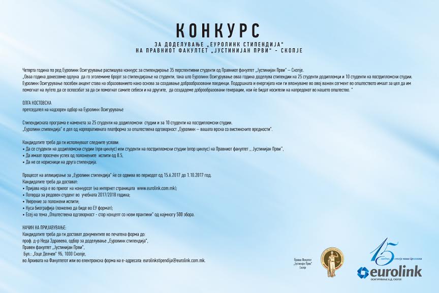 Еуролинк осигурување во рамките на платформата за Корпоративна општествена одговорност „Еуролинк – вашата врска со вистинските вредности“ четврта година по ред распишува конкурс за доделување 35 Еуролинк стипендии за 25 […]