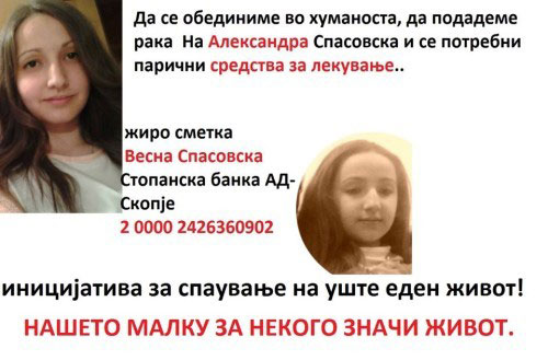 Александра Спасовска беше прекрасно послушно дете до 07 04 2014 година- кобниот ден кога имаше пад од велосипед. Од тогаш е во тешка општа состојба и кај неа беше двапати […]